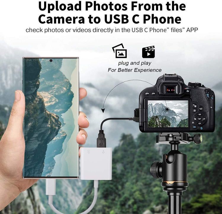 OTG USB to type C, 2 in 1 OTG adapter boosts both one USB A 3.0 and one USB C port supporting high data transfer and charging your device simultaneously. USB 3.0 Type C male to USB A female OTG adapter supports connecting your hub, USB storage, hard dish, keyboard, mouse and more USB devices. As a USB camera adapter, just plug in and it helps you to transfer data, photos and videos into your smart phone with fastest speed, an smart choice for copying photos or videos from the camera in a short time.